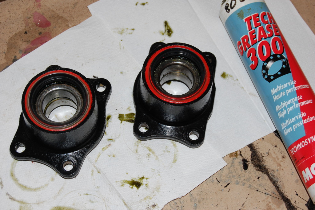 Išploviau galinius guolius, sutepiau ir surinkau. Pabandžiau surinkti galinę stebulę. 14" skardinis ratas telpa. Teko nupjauti varžto kyšantį galiuką, ir tai tarpas vos keli milimetrai.