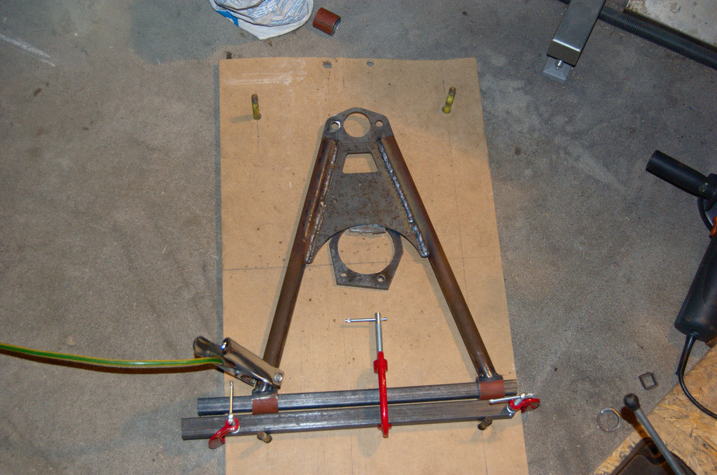 Užvakar suvirinau priekinę šakę. Nukreivojau -- bush tube'ai išėjo 5 mm per arti. Šiandien vieną nupjoviau, nudrožiau ir naują į vietą įvirinau.