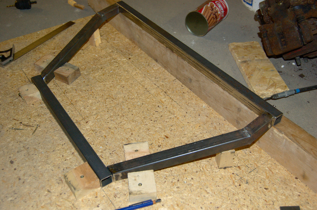 Haynes forume žmonės skundėsi, kad sunkiai sueina priekinės pakabos kronšteinai, tenka įvirinti ~3 mm pastorinimus, kad siektų rėmą su norima pakabos geometrija. Pamatavau tada vasarą ir pas save -- nu tikrai, nesueina po 2-3 mm kiekvienoj pusėj. Vakar išpjausčiau ir pervirinau priekinį rėmą, kad po pakabos kronšteinai lengvai sueitų. Neintuityvus atradimas: Jei norim, kad šoninės rėmo plokštumos būtų statmenos pagrindo plokštumai, šoninių vamzdžių priekinės (viršutinės) plokštumos nesutaps! Atrodo, kad vamzdžiai "pasisukę".